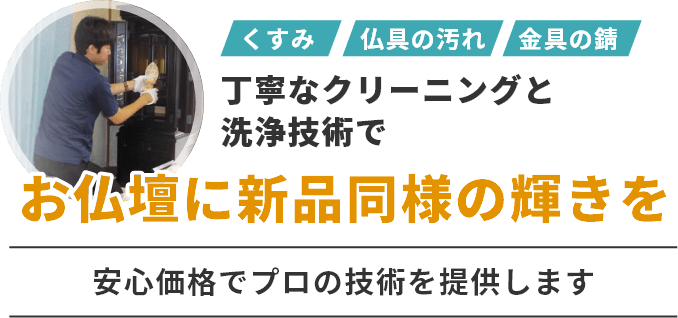 お仏壇をきれいにする方法として主に「洗濯」と「クリーニング」があります。この違いは解体をするかしないか、という点になりますが、プログレスの仏壇クリーニングは「洗濯」とは違い、お仏壇の解体はせず、そのままの形で洗浄いたします。解体をしなくても経験豊富なスタッフが特殊な技術と薬剤を用いて、きれいにお仏壇を洗浄いたします。解体をしない分、時間と手間がかからず、低価格でサービスをご提供できます。